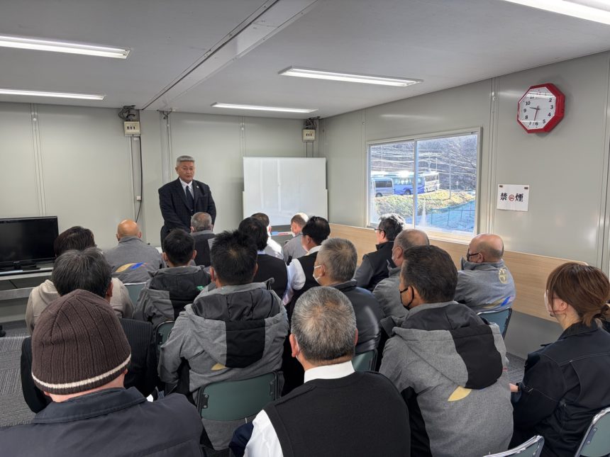 仕事始め式に先立ち、菩提山往生院極楽寺の間野住職に今年の事業の安全と乗務員等関係者の健康祈願を執り行っていただきました。引き続き行われた仕事始め式では、草野代表取締役から年頭のあいさつとして、旅客及び貨物の安全輸送と関係法令を遵守すること、関係者の健康保持・増進に努めてほしいことなど訓示があり、乗務員等一同は気持ちも新たに今年の輸送の安全を誓いました。